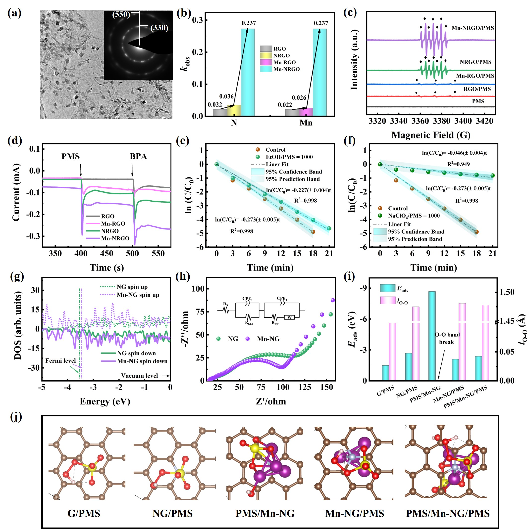 据文章报道,同时负载过渡金属(TM-NPs)和掺杂氮元素的碳材料被大量的报道用于活化PMS降解有机污染物,但其活化机制仍然存在争议,TM-NPs和氮元素之间的互作效应仍未得到合理解释。该研究基于构效关系理论巧妙地制备出负载零价锰的氮掺杂还原氧化石墨烯(Mn-NRGO),并将其用于PMS活化,以实现水体中典型内分泌干扰物双酚A(BPA)的脱毒。与还原氧化石墨烯(RGO)、氮掺杂还原氧化石墨烯(NRGO)和负载零价锰还原氧化石墨烯(Mn-RGO)相比,Mn-NRGO具有最高的活化PMS降解BPA的表观速率常数(kobs=0.273),通过不同活化剂之间kobs的比对,揭示了Mn-NPs与氮之间的显著协同效应。根据化学牺牲剂实验、电子顺磁共振测试、PMS化学计量效率、线性扫描伏安和原位拉曼光谱等结果,揭示了外球绑缚活化剂-PMS复合体介导的电子传导路径在BPA降解过程中占支配地位。基于动力学研究结果,明确了协同效应的贡献至少为70%。DFT理论计算表明Mn-NG费米能级要比NG的费米能级高0.03 eV,Mn-NG更易将电子给予PMS,HSO5–吸附能(Eads)和氧氧键键长(lO-O)的计算结果表明,Mn-NPs和掺杂N之间的协同效应依赖于Mn-NPs和HSO5–之间的紧密结合,这种结合作用使得整个NG碳片上的电荷分布更不均匀,进而引发更多的HSO5–吸附到NG碳片上。这些新产生的吸附作用将诱导活化剂-PMS复合体的形成,强化电子传导路径的贡献。