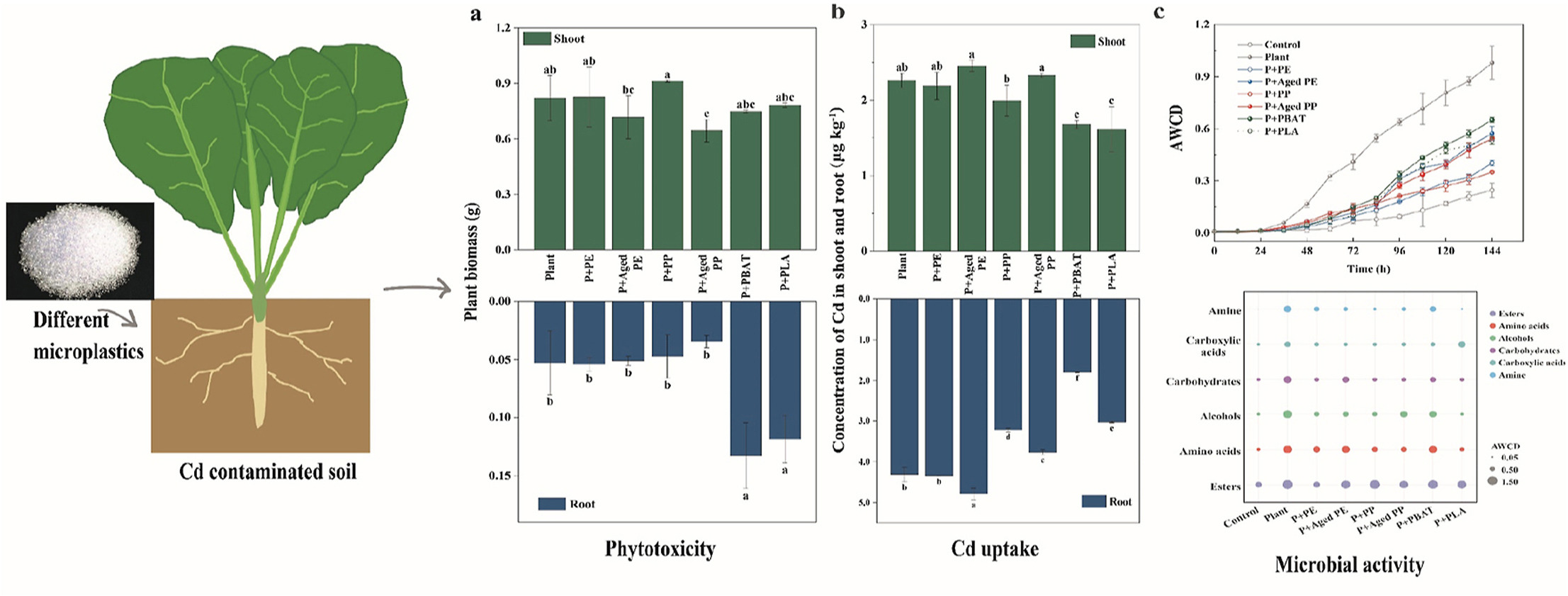 本文通过盆栽试验,研究了6种不同类型的MPs(PE、PP、老化PE、老化PP、PBAT、PLA)在镉污染土壤中对芥菜生长、镉积累、微生物代谢活性等的影响进行分析,以评价MPs和Cd在土壤-植物系统中的联合生态毒性。研究发现,老化微塑料 PE、PP及可生物降解微塑料PBAT、PLA对芥菜具有生物毒性,导致其叶绿素含量和地上部生物量的降低。种植芥菜显著提高了土壤pH,可生物降解MPs存在时,土壤pH分别增加0.4及0.6个单位。PBAT的存在降低了土壤中可提取态镉及植物中的镉积累。单独种植芥菜能显著提高微生物的代谢活性指标—AWCD值,但6种MPs的添加均能导致AWCD值的降低,表明微塑料抑制了土壤微生物的代谢活性。MPs可明显影响微生物对不同碳源利用活性,添加PBAT可提高酯类和醇类的微生物利用效率,而PLA可提高羧酸类的微生物利用效率。这些结果表明,MPs和镉的共同暴露可能会改变土壤微环境特征,如土壤pH的改变从而影响镉的生物利用率以及土壤微生物群落碳代谢能力的变化。