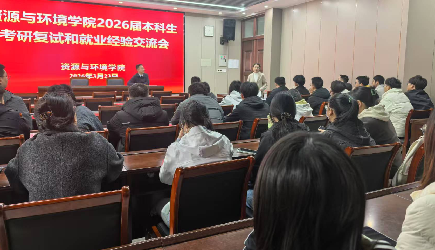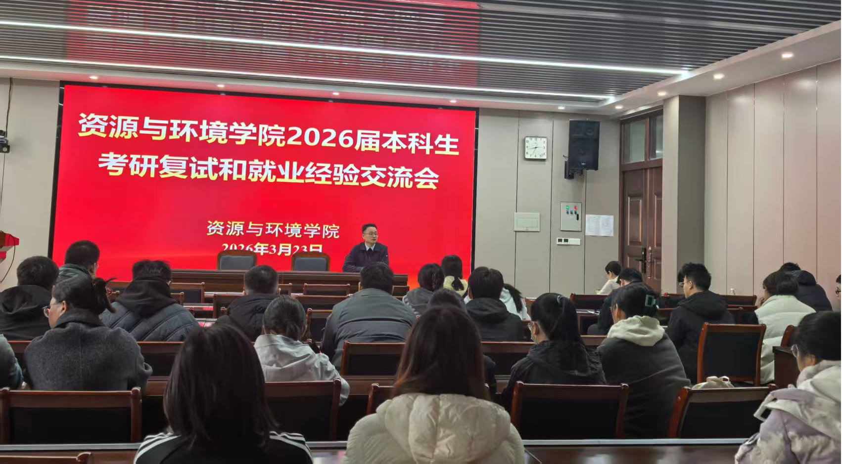 土壤环境系组织召开考研复试和就业经验交流会。系主任马双龙、毕业生班主任等专业教师、2026届环境生态工程专业本科生共同参加。