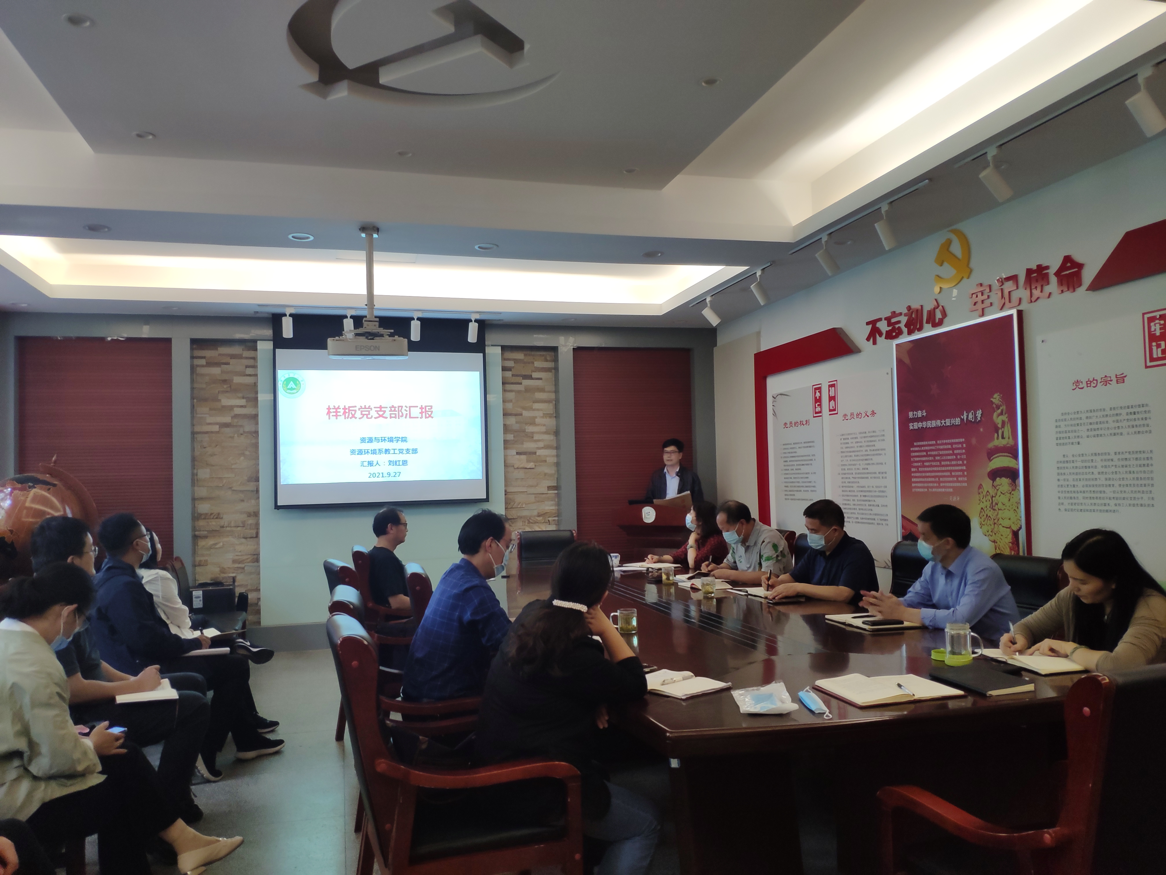 资源环境系样板党支部书记刘红恩从支部基本情况、支部工作基础、支部建设思路、支部建设任务落实等四个方面对样板支部建设情况和下一步的工作打算进行了汇报。