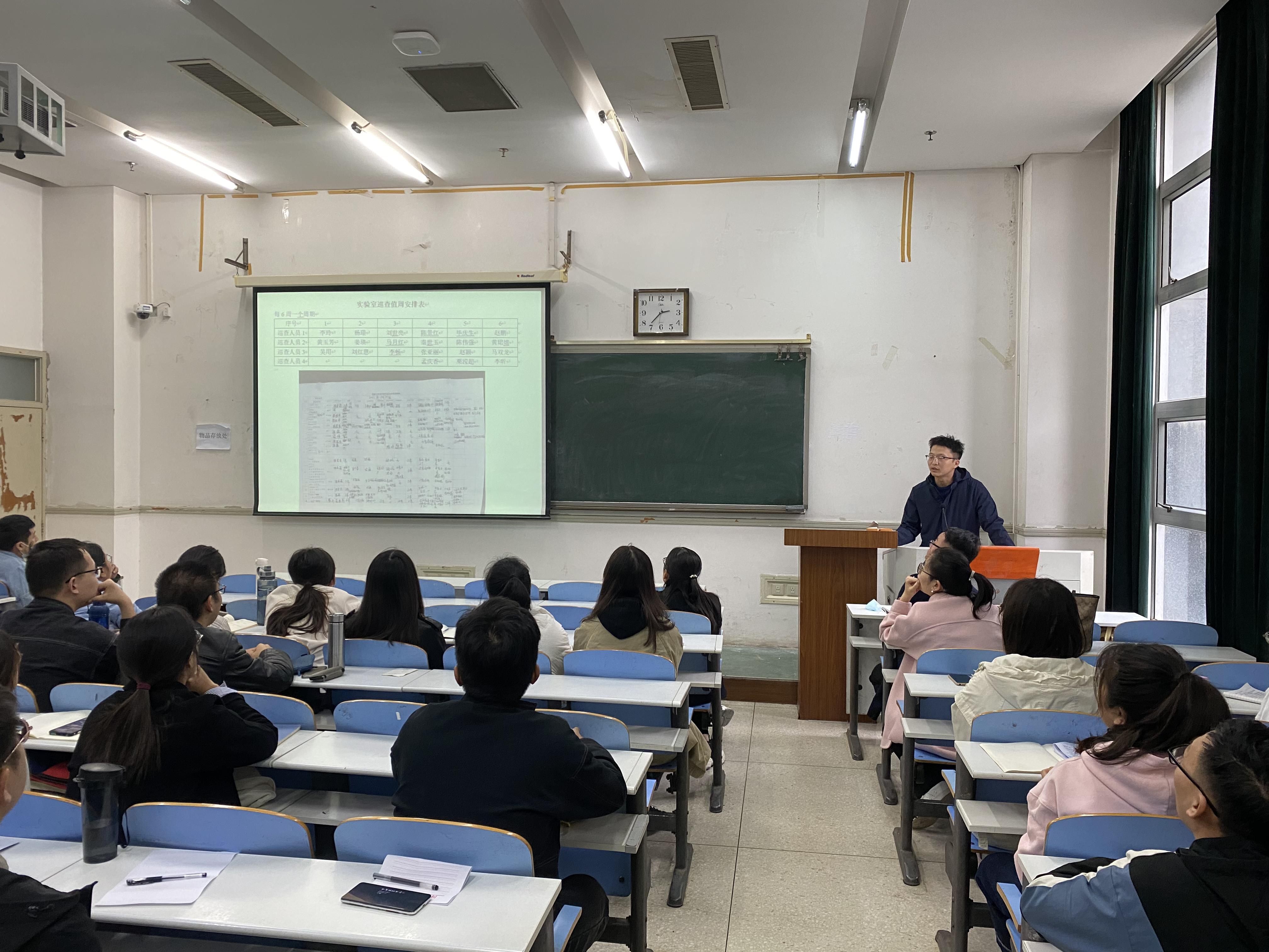 秦世玉就实验室安全须知、实验室安全操作技能、常见安全标志、消防安全及险情处理和逃生自救为大家进行了深入浅出的讲解和分析。盛开老师通过对实验室典型事故分析,从实验室基本制度、大型仪器使用制度、危险化学品的存放、化学废弃物的处理及应急预案等方面进行了详细的阐述。随后,进行了实验室安全考试,考核合格的研究生才能凭实验室准入证进入实验室工作。