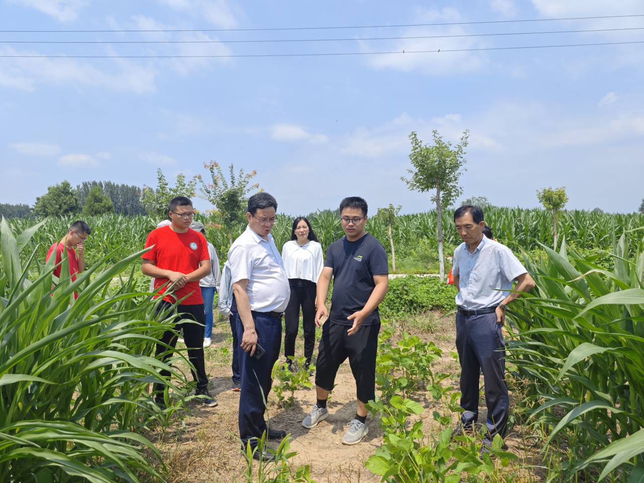 领导听取了实践团队关于社会实践进展情况与收获,并与小院师生、许河乡政府人员就如何助力许河当地农业发展进行讨论交流。随后,大家一起到科技小院示范基地观察玉米生长情况,并合影留念。
