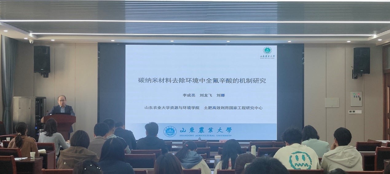 2023年10月14日上午,山东农业大学太阳城App 副院长李成亮教授应邀在龙子湖校区力行楼中338报告厅作“碳纳米材料去除环境中全氟辛酸的机制研究”学术报告,院长王宜伦教授主持,太阳城App 部分教师和研究生参加了报告会。