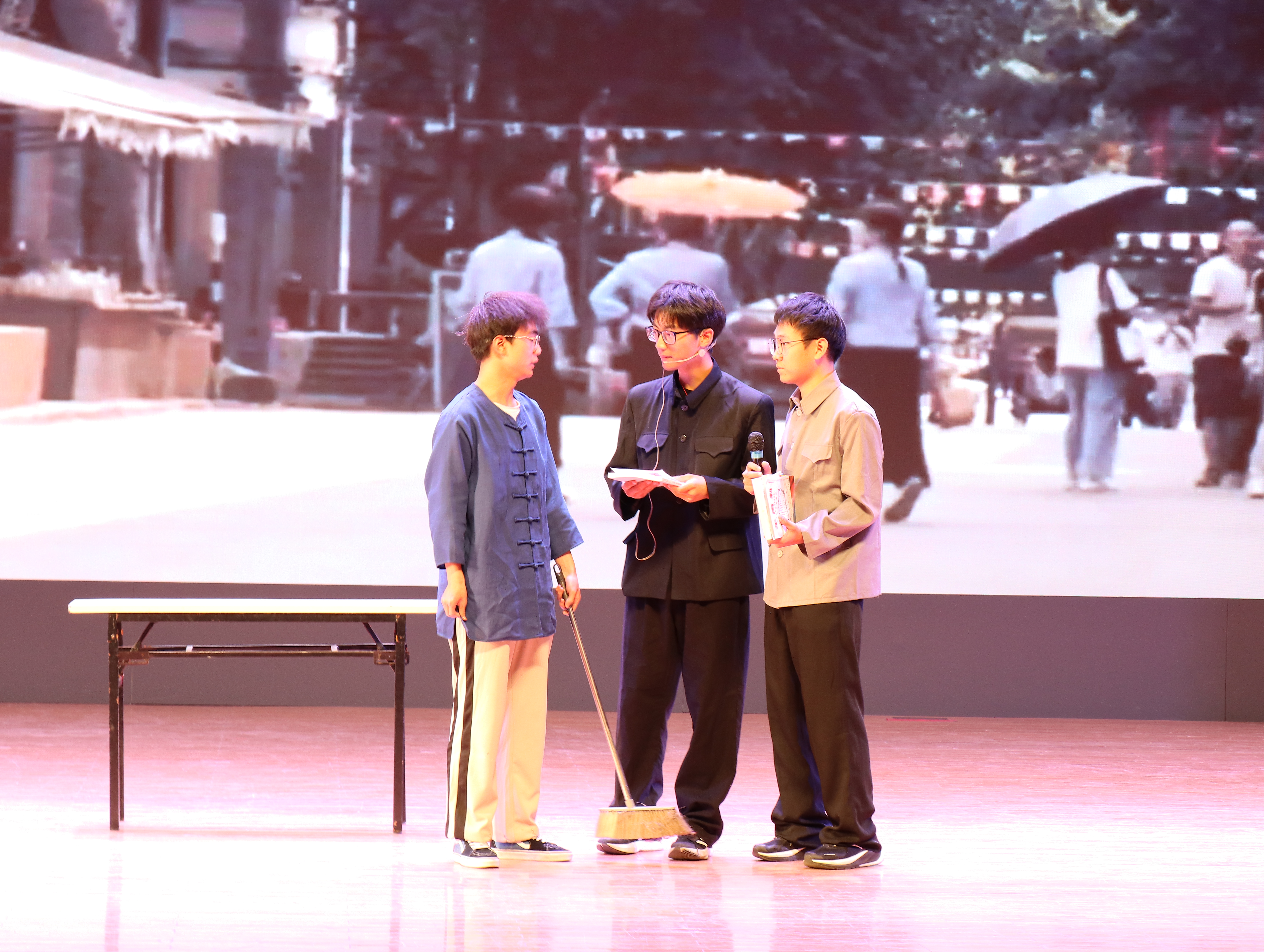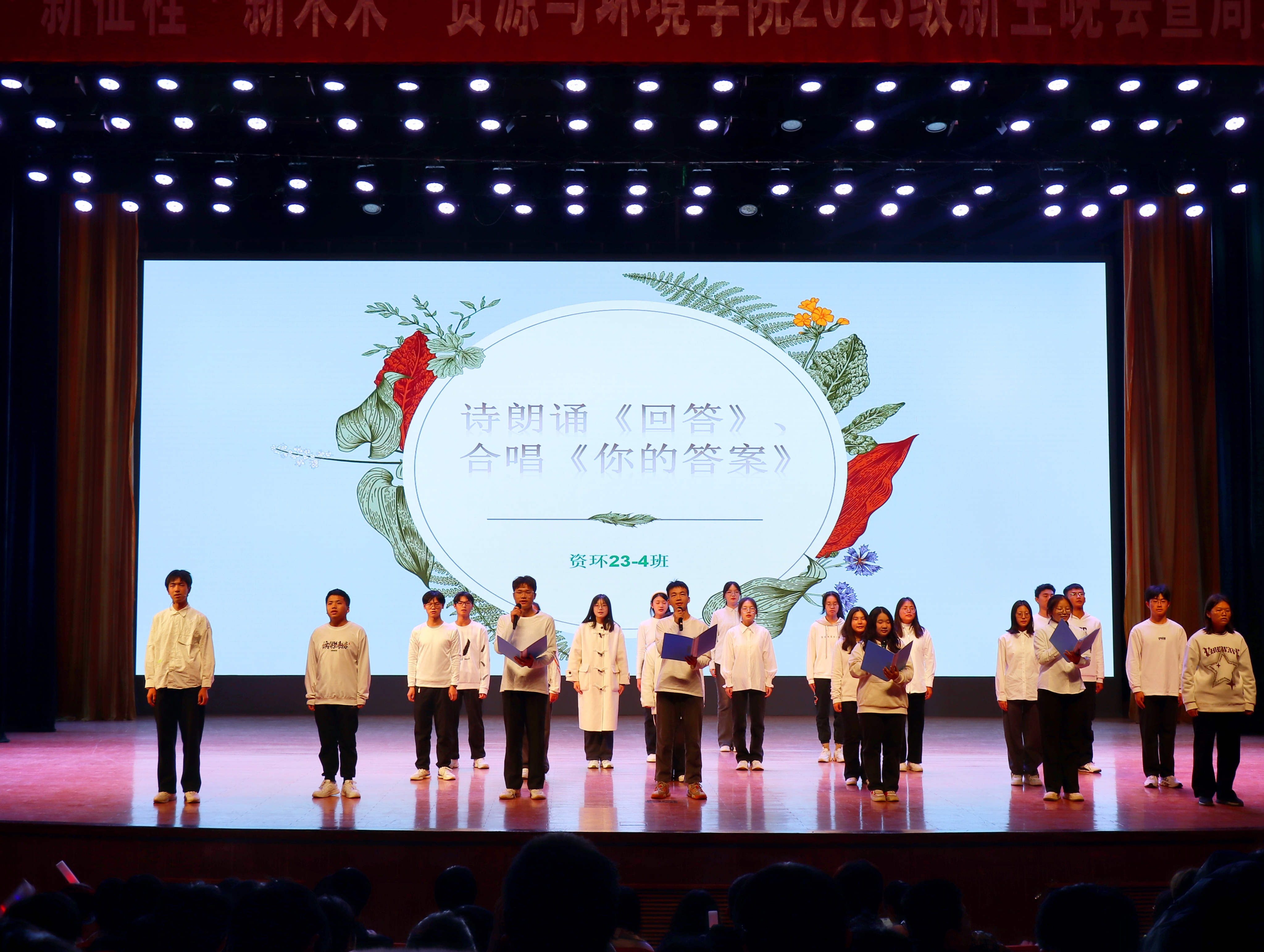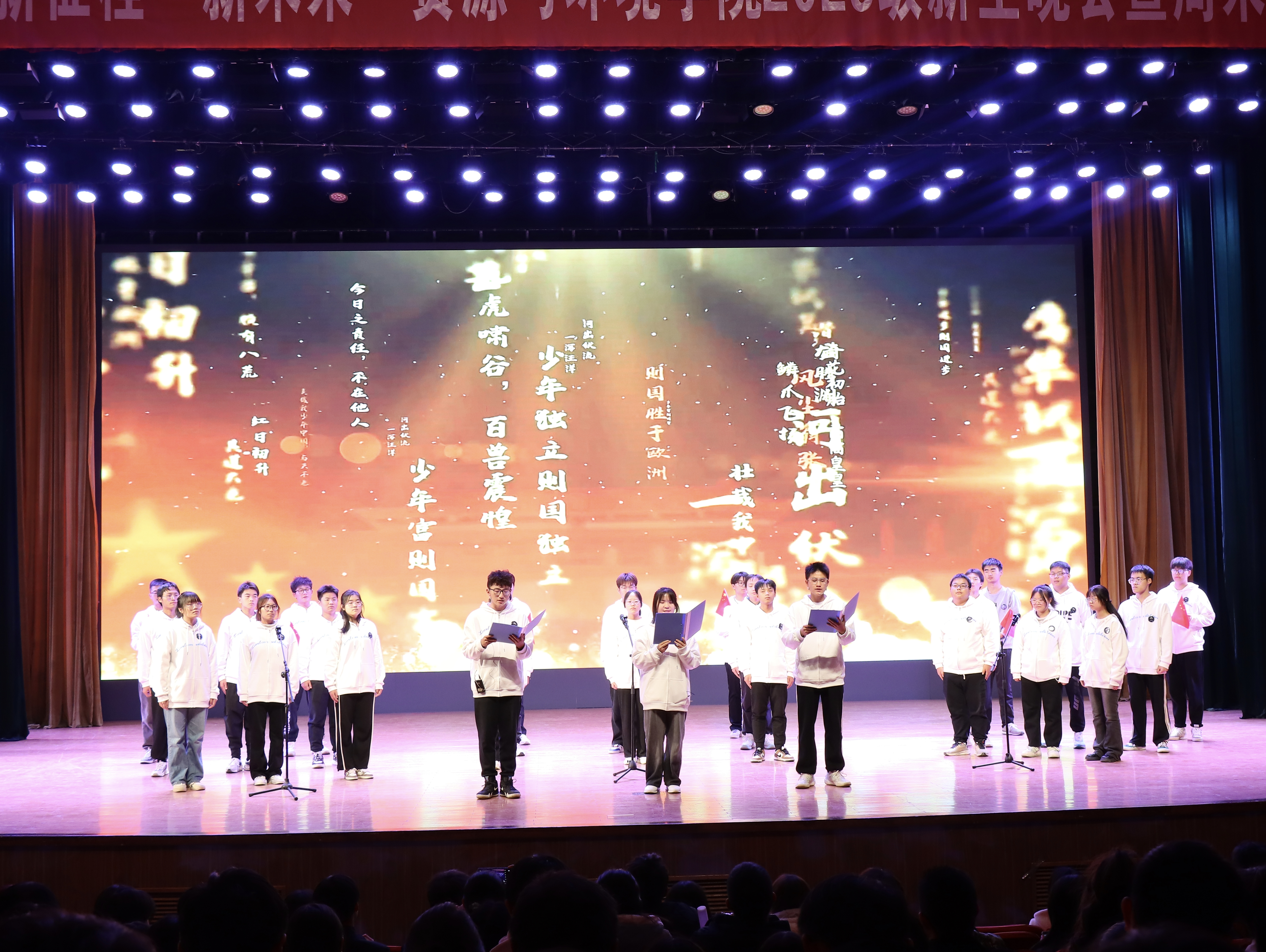 晚会在古典舞蹈《怎叹》中正式拉开帷幕。朗诵《中国少年说》、《中国红》、《青春颂》等,激励着在场学生以青春誓言践行报国之志;情景剧《满江红》、《灯火阑珊处》等,使大家在深刻体会百年征途的艰辛坎坷中厚植爱国情怀;歌舞《Love story》、《情非得已》、《你从未离去》、《Girls》等洋溢着青春气息,充分展现了23级新生坚定向未来的决心。最后,邓晓铮老师和在场助班为全体新生献唱歌曲《老男孩》、《后来》并寄语23级新生,希望他们在未来可以披荆斩棘、一往无前、越来越好!