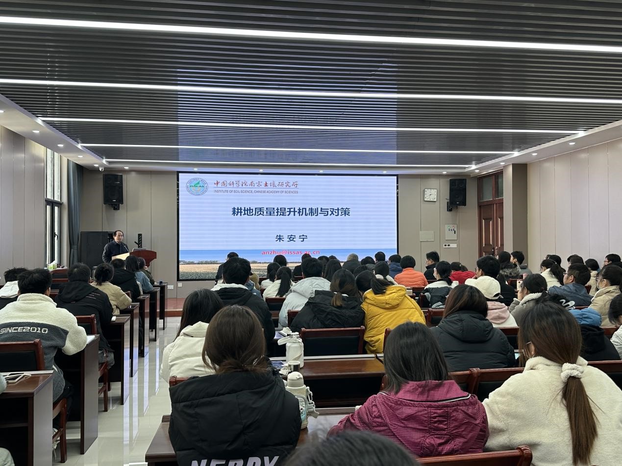 师生作“耕地质量提升机制与对策”学术报告,部分教师和研究生参加,院长王宜伦主持。