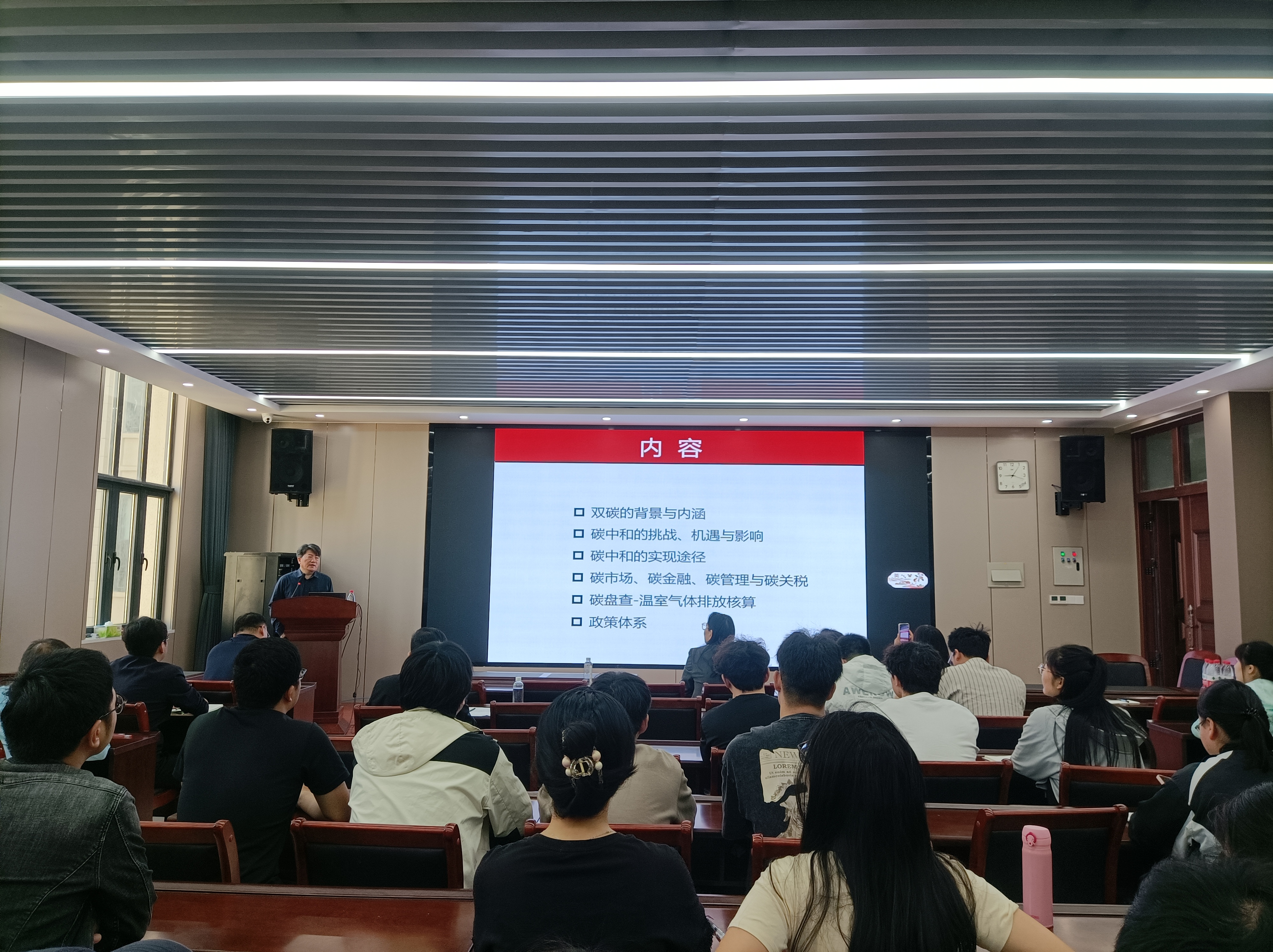 董孝斌教授首先向师生介绍了“双碳”的背景与内涵,简述了碳中和的挑战、机遇与影响,然后详细讲解了碳中和的实现途径,并介绍了碳市场、碳金融、碳管理、碳关税、碳盘查以及当前碳中和的政策体系等内容。董老师还讲述了碳中和途径中的关键路径和重点行业,对太阳城App 师生研究方向和侧重点有着重要的启发。