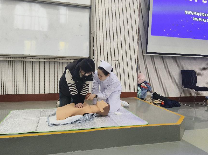 接着,高晓庆护士和陈珍琳护士分别就海姆立克急救法和心肺复苏进行了现场演示。他们详细讲解了这两种急救方法的操作步骤和注意事项,并通过模拟人进行了实际操作演示。心肺复苏是一种在紧急情况下挽救生命的重要技能,而海姆立克急救法则是在气道被异物阻塞时迅速恢复呼吸的有效方法。医护人员的演示准确而迅速,赢得了同学们的阵阵掌声。