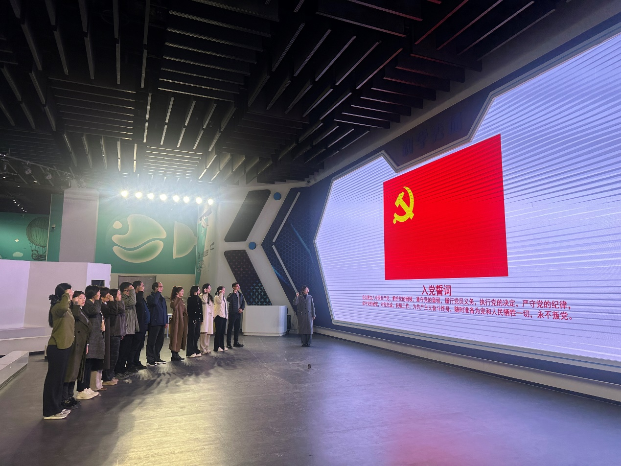 支部党员在讲解员的带领下依次参观了动物家园、智慧人类及人工智能等展厅。在动物家园展厅,400余件珍稀动物标本以沉浸式场景再现,让党员们深刻体会生态保护的重要意义;在智慧人类展厅,从人类进化到脑科学研究的人类智慧发展历程,使大家对科技创新与 “育人先育智”有了更深理解;在人工智能展厅,智能机器人、自动驾驶模拟等前沿应用,让党员们近距离感受科技魅力。随后,全体党员面向党旗庄严伫立,重温入党誓词,筑牢初心使命。最后,观看纪录片《筑梦天宫》,沉浸式感受我国航天事业辉煌成就,进一步激发民族自豪感与责任担当。