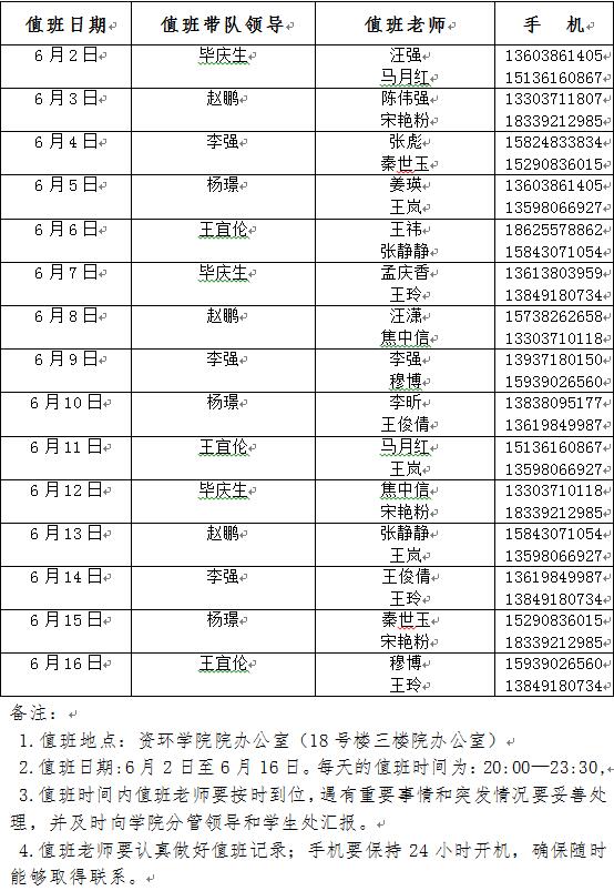 资环太阳城App 2017届毕业生离校期间值班安排表
