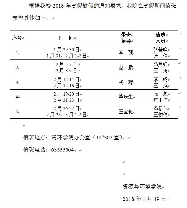 资环太阳城App 2018年春节值班安排