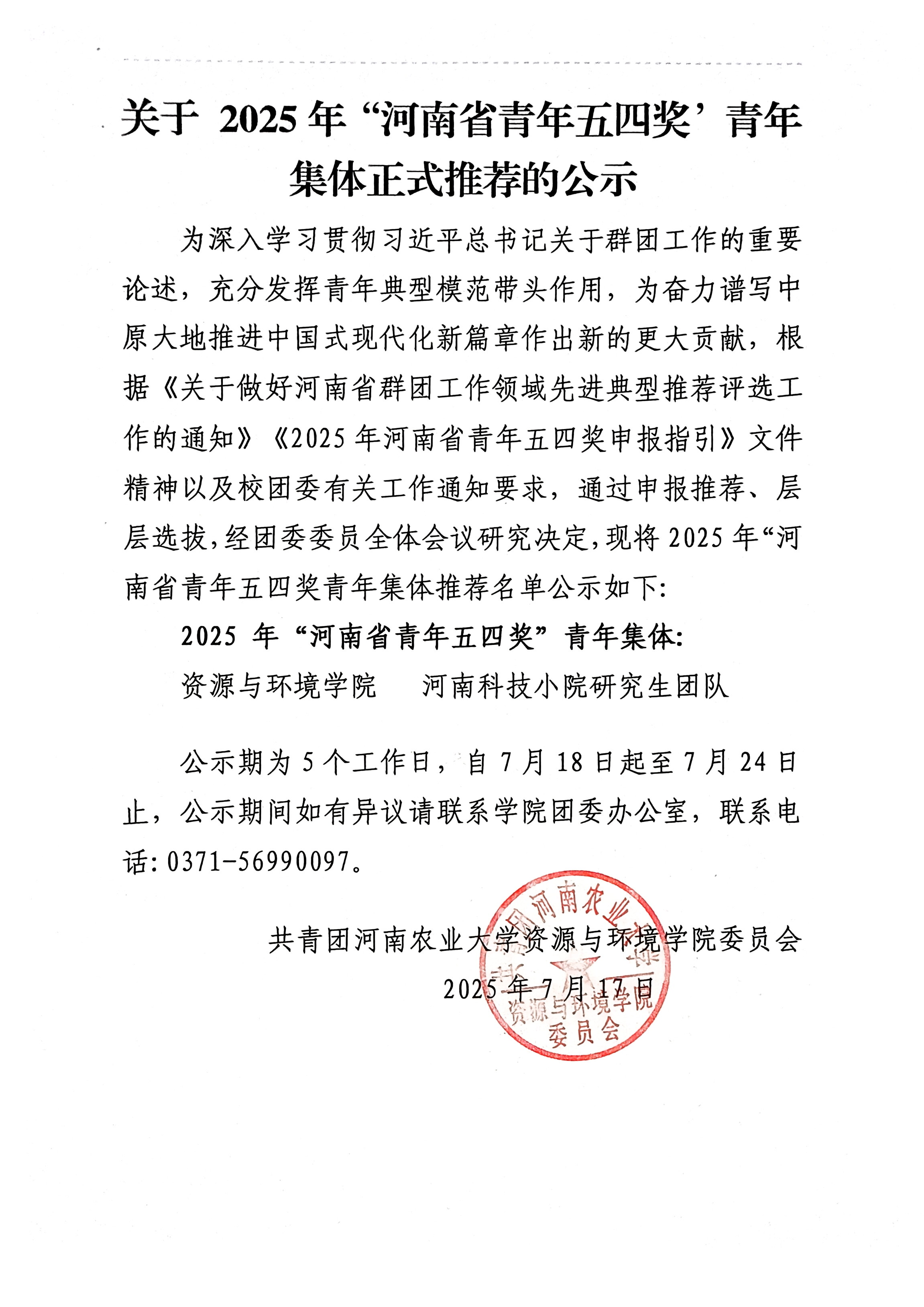 关于2025年“河南省青年五四奖’青年集体正式推荐的公示