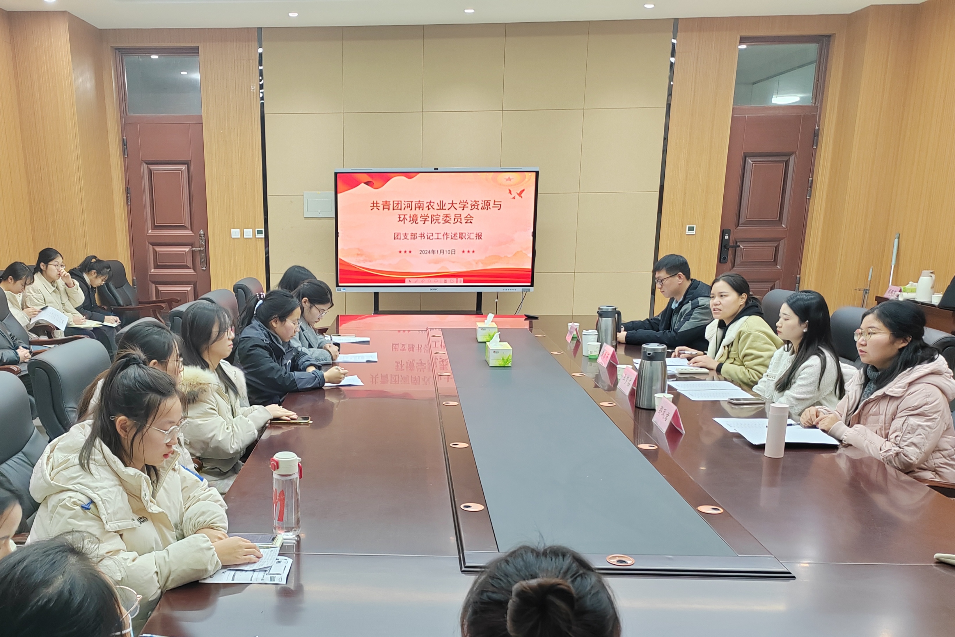 于2024年1月10日晚在力行楼254会议室召开2023年团支部书记述职评议会。团委副书记黄春萌、团委老师邓晓铮、王梦茹、郑凤君担任评委,22名团支书进行现场述职汇报。