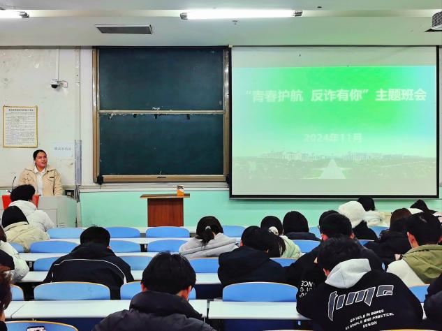 团委副书记黄春萌为2024级全体学生主讲“反诈一节课”,通过讲解大学生群体中常见被骗案例,提醒同学们不要轻信陌生来电和短信,不向陌生人透露自己的身份证号、验证码等重要信息,不浏览非法网站或点击不明链接,不贪小便宜,不心存侥幸,不让不法分子有机可乘。