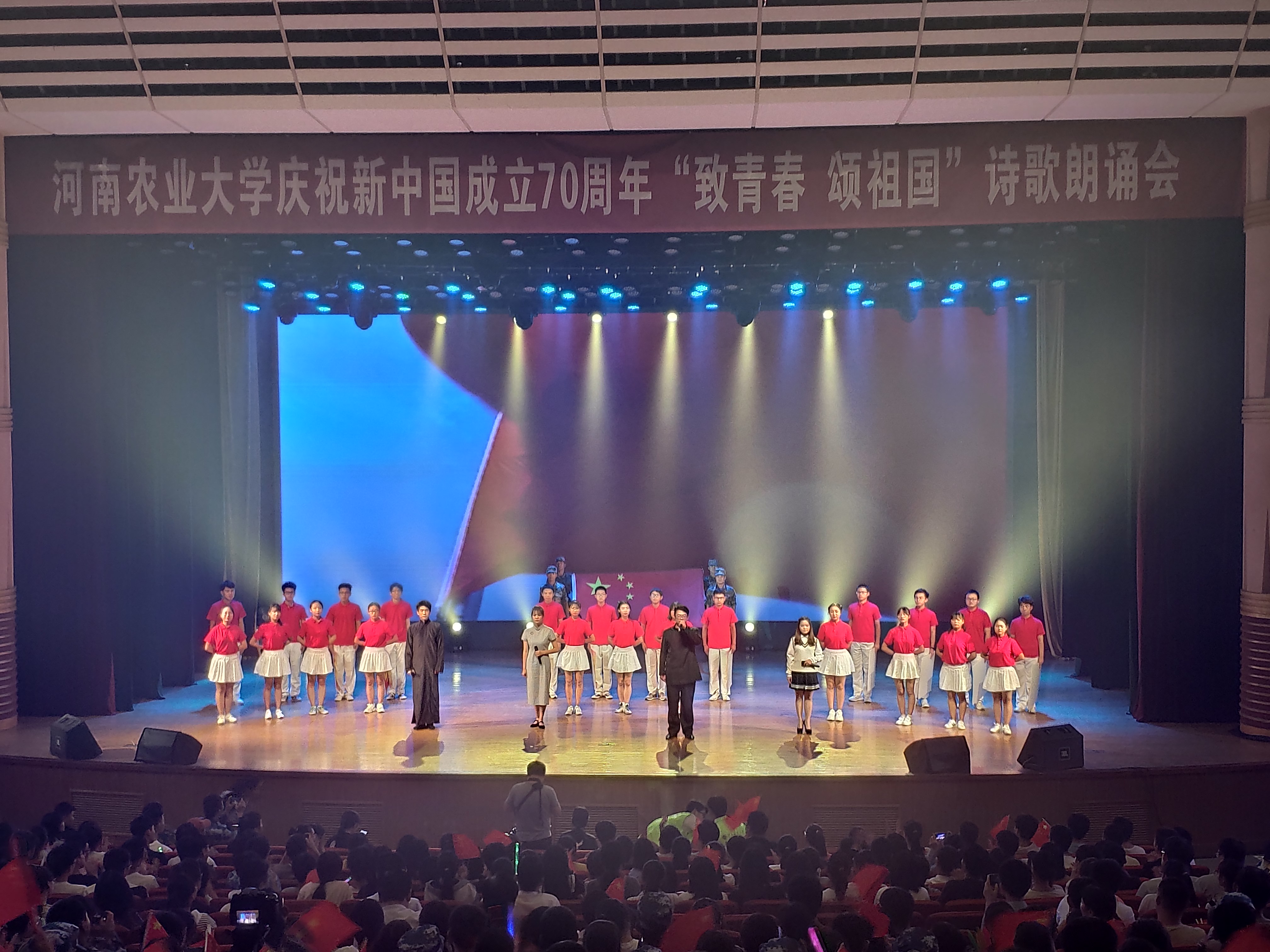 在比赛过程中,太阳城App 参赛节目首先以舒缓空灵的歌唱祖国歌曲引出革命先烈方志敏《可爱的中国》、赵一曼家书及叶挺《囚歌》的人物朗诵,激昂深情的朗诵带领观众重温往昔峥嵘岁月,感受革命先烈英勇豪情。紧接着学生热情讴歌新时代,表达对祖国七十华诞的深情祝福,退伍学生代表高举国旗入场宣誓,庄严宣誓振奋人心,催人奋进。节目最后,学生激情高歌歌唱祖国带动全场观众大合唱,将现场氛围推向高潮。内涵丰富、青春活力的节目形式赢得现场观众的阵阵掌声。