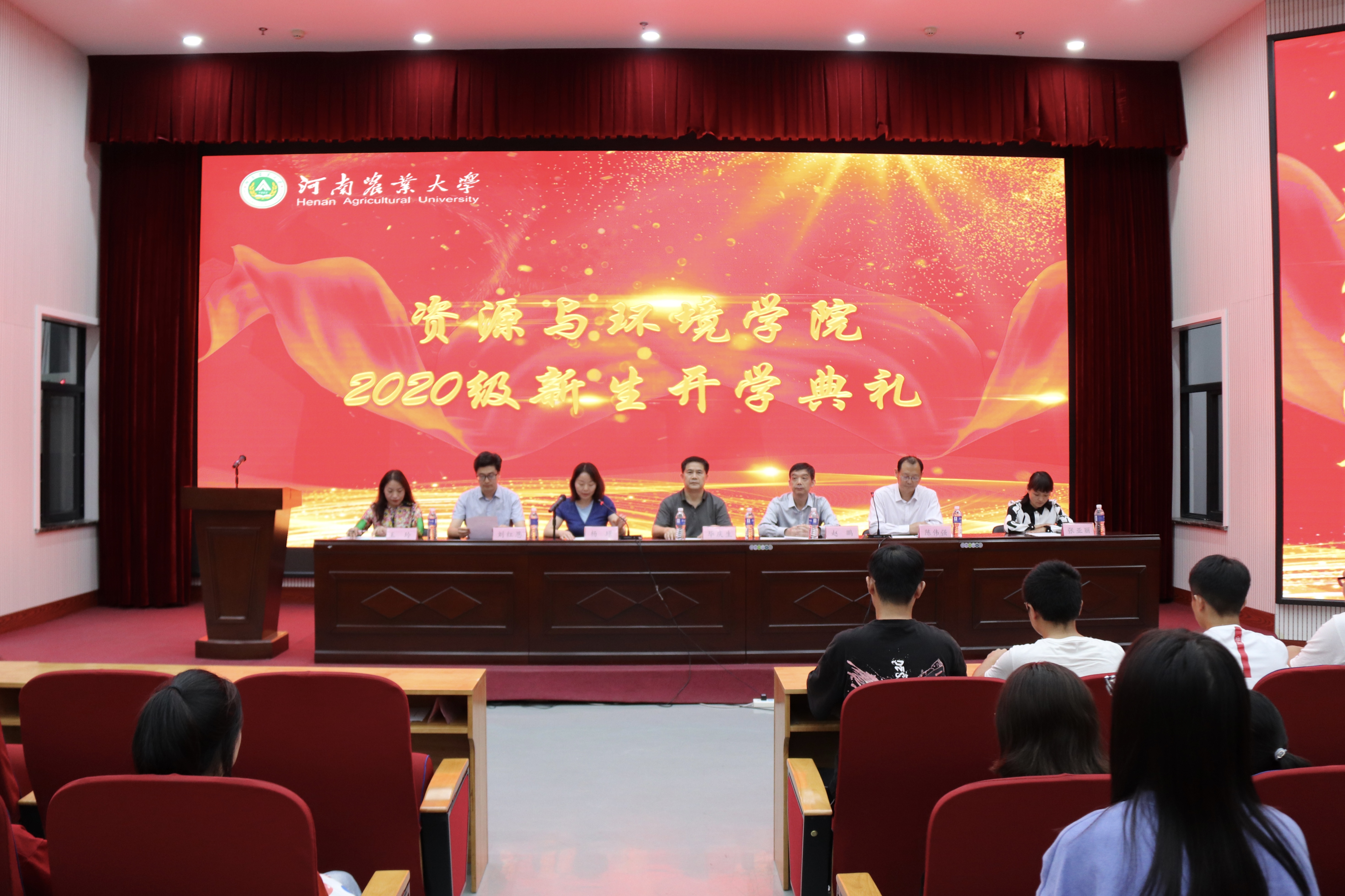 2020级新生开学典礼,院党委书记毕庆生、院长赵鹏、副院长杨璟、资环系主任刘红恩、土管系主任陈伟强、地城系主任张亚丽、团委书记王玲以及2020级新生班主任助理和全体新生参加了本次典礼。
