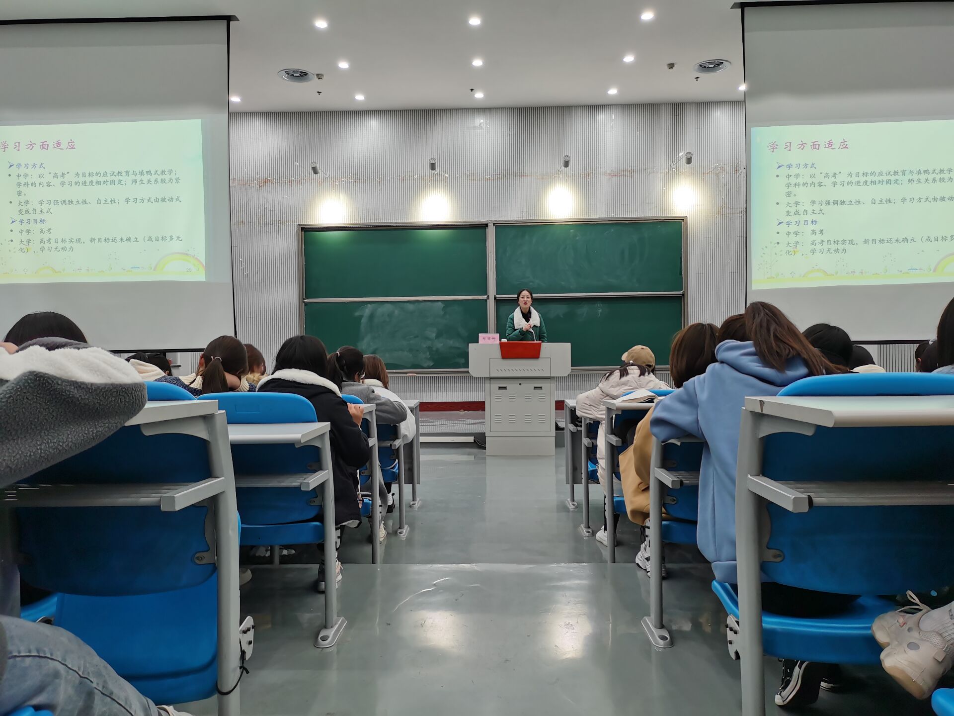 在龙子湖校区大教室2成功举办新生心理健康知识讲座,校心理健康教育中心心理咨询师郑丽娜老师受邀为同学们开讲,辅导员胡明阳及全体2020级新生参加了此次讲座。