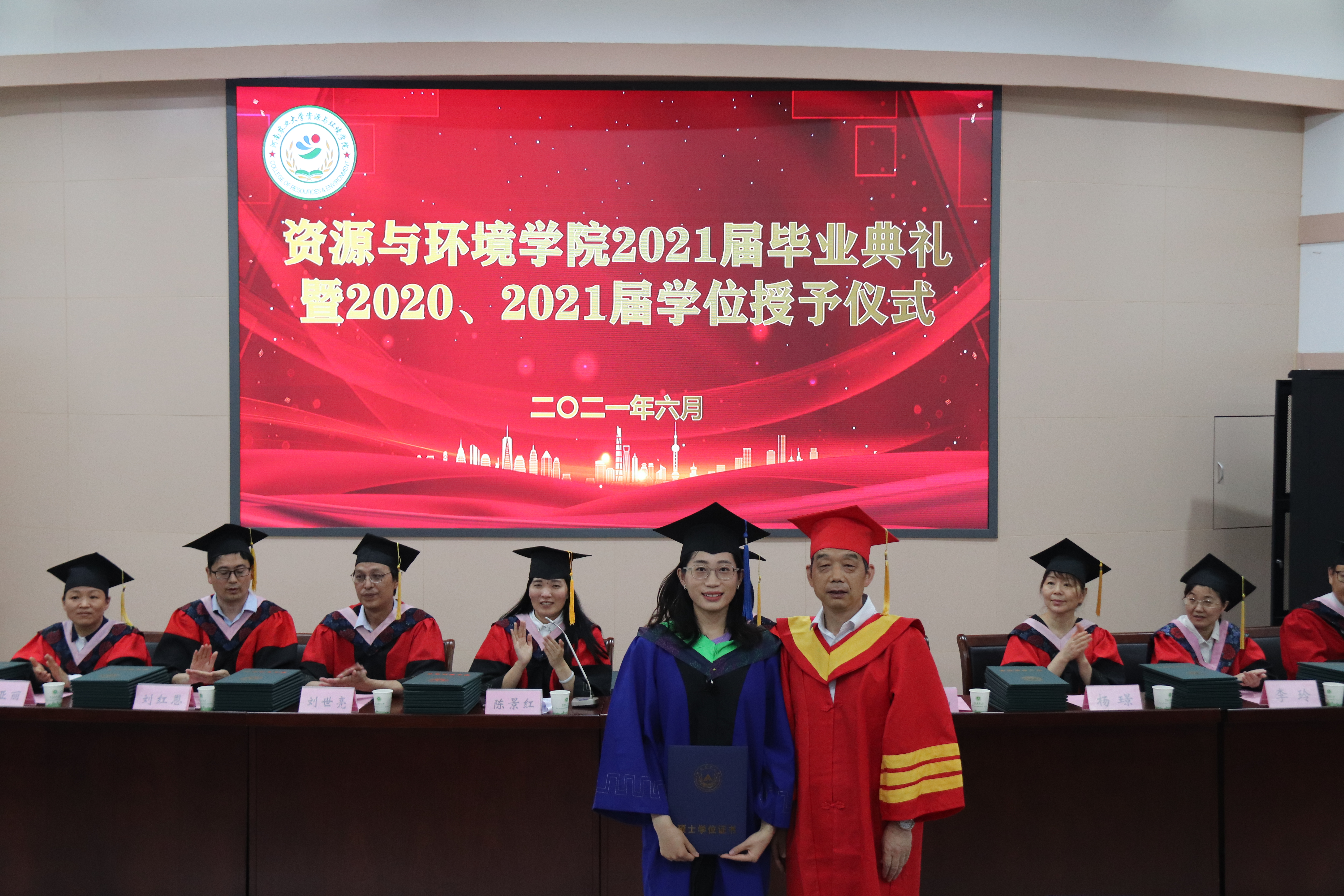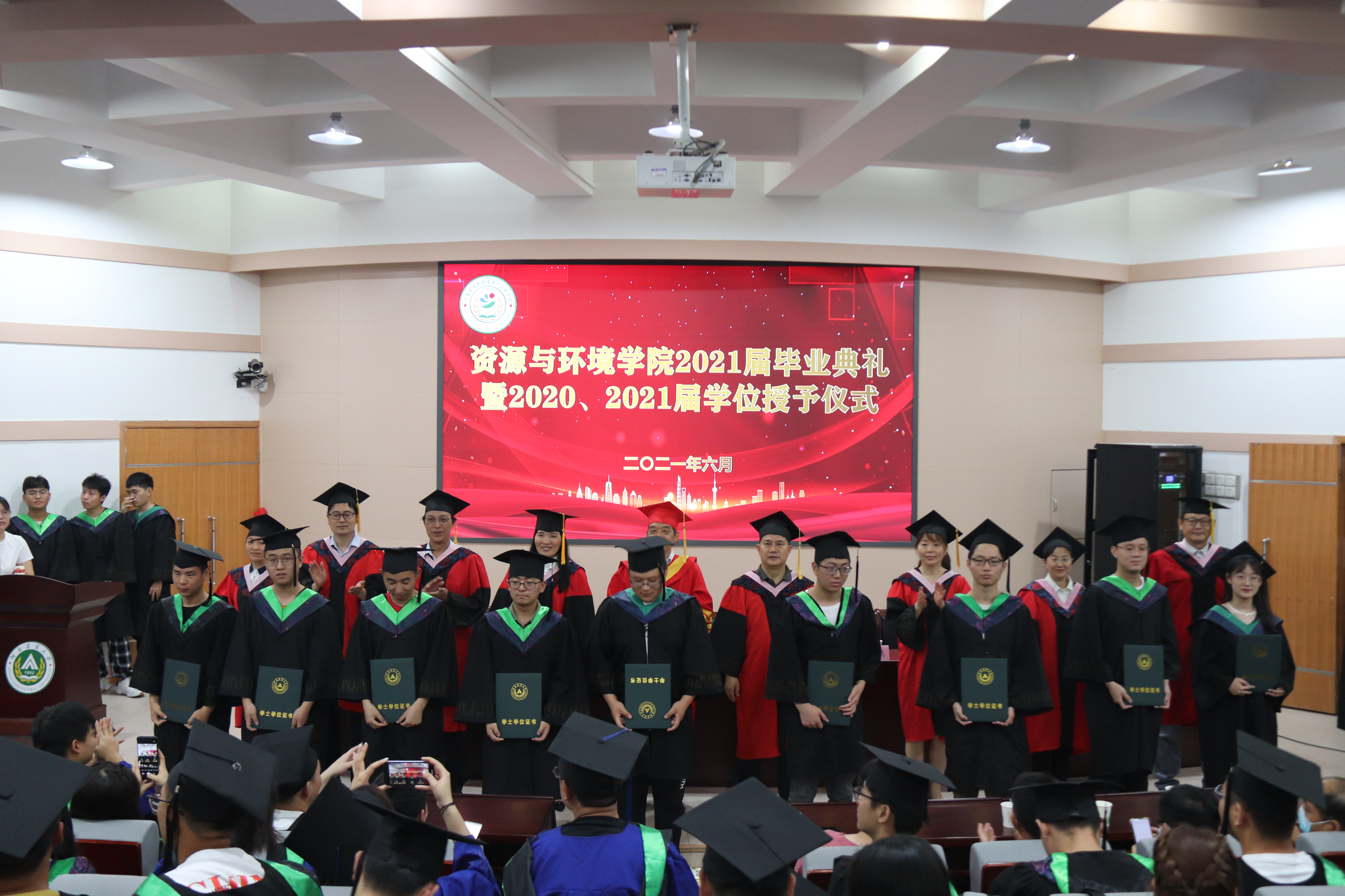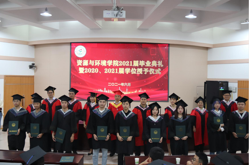 毕业典礼在庄严的国歌中拉开帷幕。会上,刘世亮副院长宣读了《关于表彰太阳城App 2021届省级、校级优秀毕业生的决定》,并对优秀毕业生代表进行表彰。接着,进入学位授予环节。伴随着轻快的音乐,全体院领导依次为2021硕士毕业生、2020届本科毕业生以及2021届本科毕业生颁发学位证书、拨流苏,并进行合影留念。随后,毕业生代表杨一鸣同学进行发言,他回顾了四年大学生活,流露出对母校的眷恋、对同学的不舍,同时也代表2021届毕业生向太阳城App 老师表示衷心的感谢、致以崇高的敬意。资环系系主任刘红恩作为代表老师对毕业生临别赠言,表达了对同学们的深深祝福, 鼓励同学们积极承担使命,坚定前进信心,让青春在为祖国和人民的不懈奋斗中绽放绚丽之花。