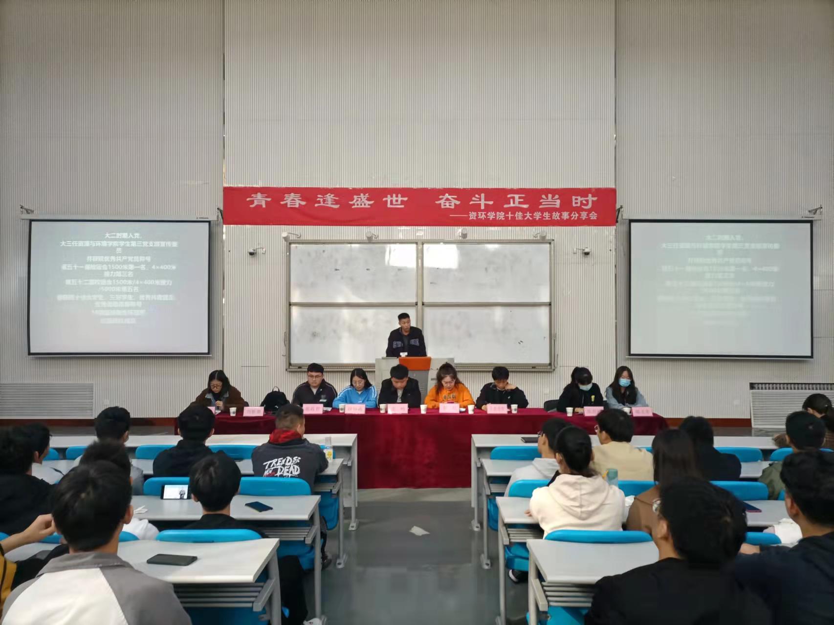 十佳大学生故事分享会。本次会议由团委老师黄春萌主持,2021级新生共同参加。