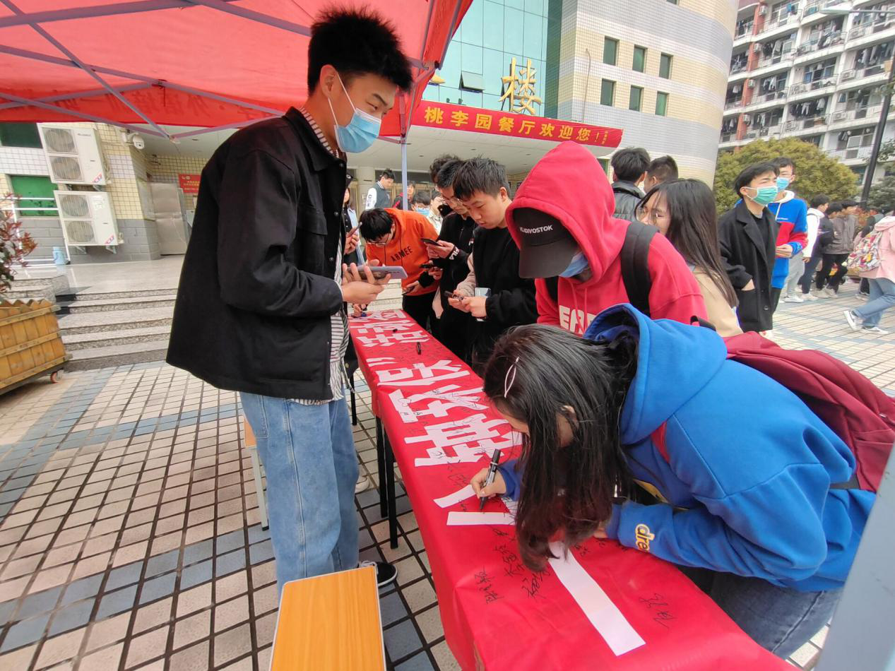 组织在校学生举行“一分钟环保”活动,在桃李园公寓,同学们自发开展“离开教室前一分钟,不忘清理桌面带走垃圾随手关灯”、“离开宿舍前一分钟,随手带走生活垃圾不忘关水关电”、“出门吃饭前多花一分钟,带好水杯饭盒,远离一次性餐具”、“出门购物前多花一分钟,随身带上环保购物袋”、“购物时多留意一分钟,选择可降解可循环的绿色商品”、“散步时多花一分钟,将脚下的垃圾扔进附近的垃圾桶”、“使用电子产品时多花一分钟,根据光线调节屏幕亮度,省电又护眼”、“活动结束后多花一分钟,清理现场,不留下一片垃圾”......活动现场,同学们还在宣传条幅上签下自己的名字,以自身言行带动更多同学树立环保意识,养成节约习惯。