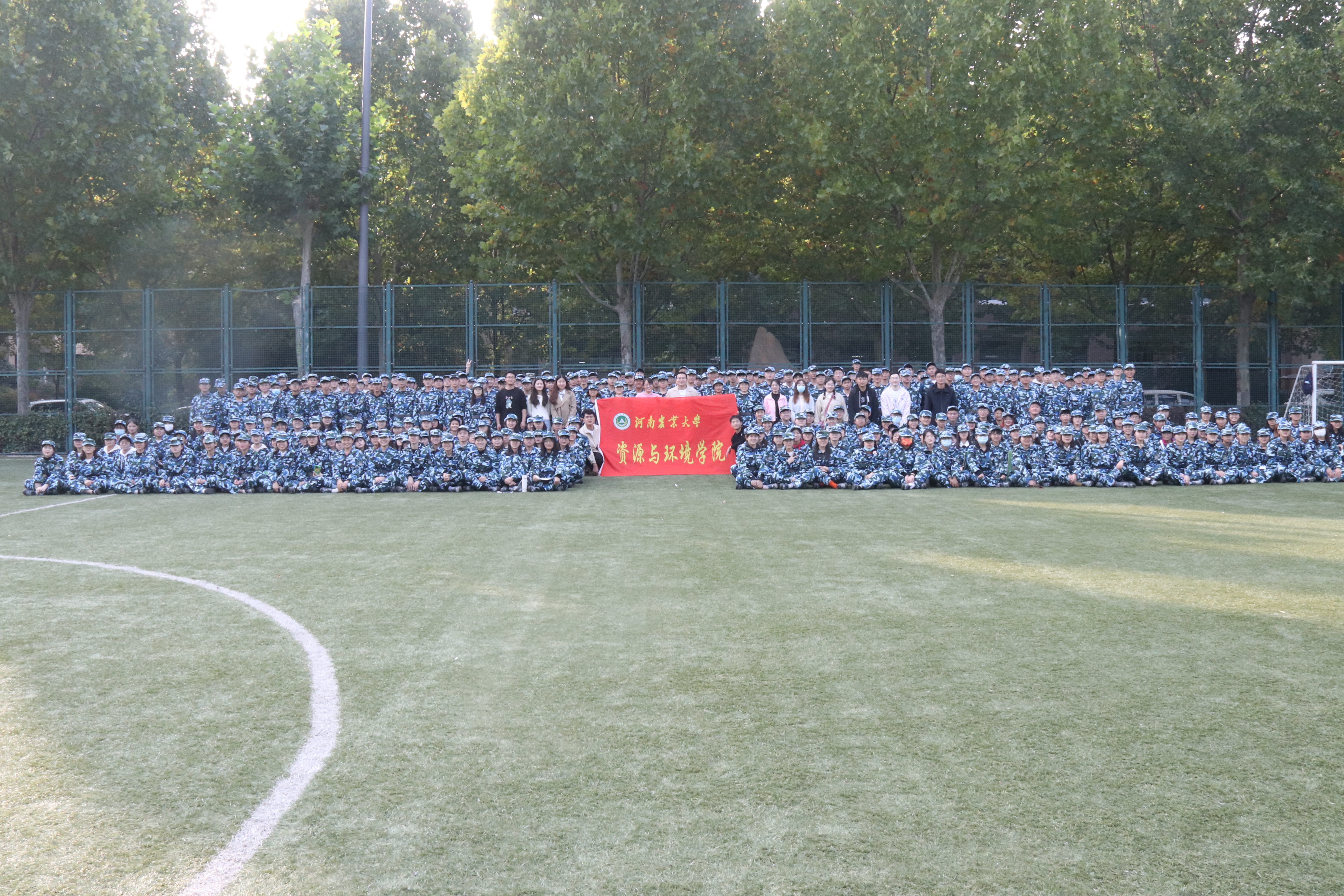 组织新生在足球场进行班歌合唱比赛。