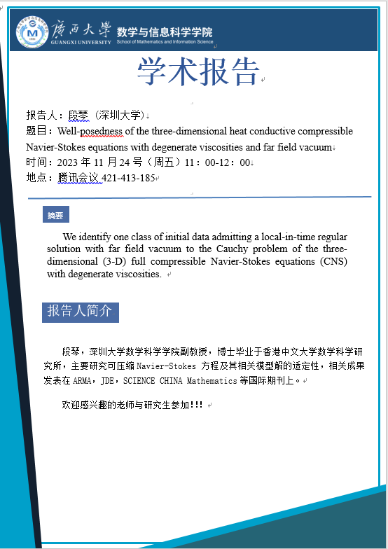 学术报告:Well-posedness of the three-dimensional heat conductive compressible Navier-Stokes equations with degenerate viscosities and far field vacuum