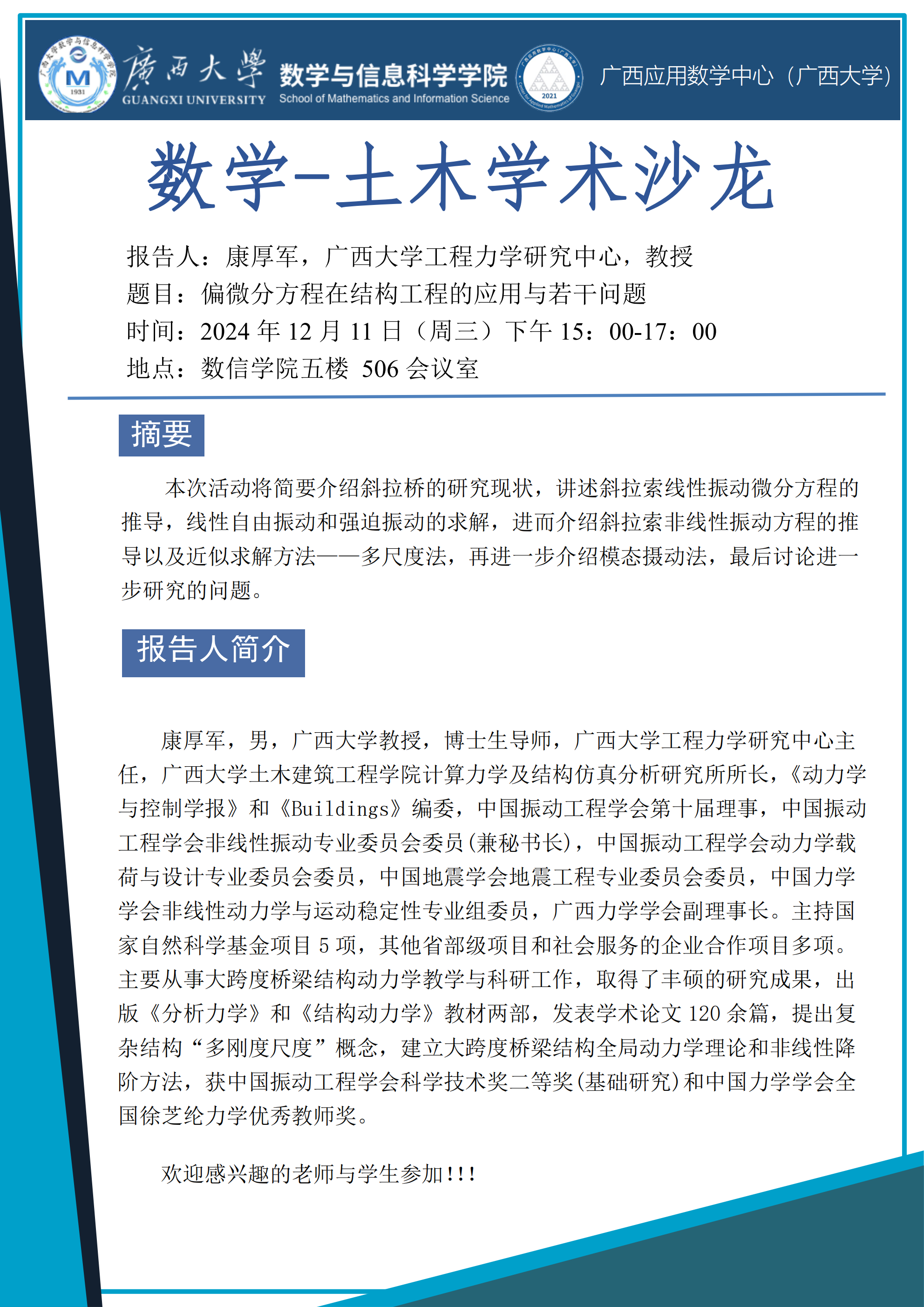 学术报告:偏微分方程在结构工程的应用与若干问题
