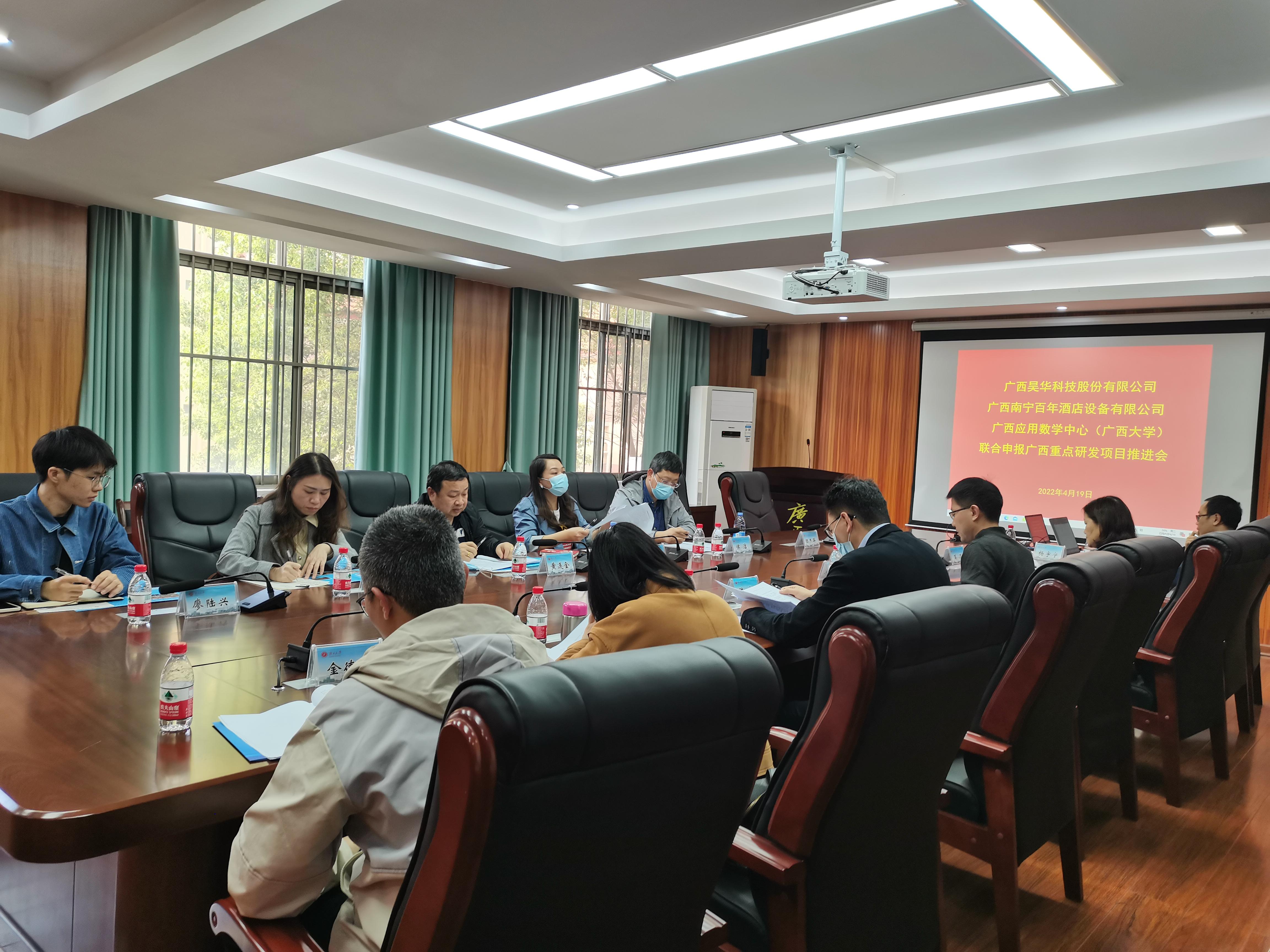 召开联合申报广西重点研发项目推进会。广西南宁百年酒店设备有限公司总经理黄连金、副总经理侯洁,广西优耐信息技术有限公司项目申报部经理梁晶,广西应用数学中心(太阳城app