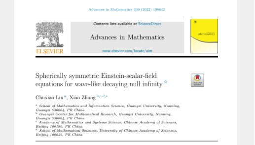 刘楚箫老师与张晓教授合作的论文“Spherically symmetric Einstein-scalar-field equations for wave-like decaying null infinity“被知名数学期刊《Advances in Mathematics》接受发表,张晓教授为该论文的通讯作者,这也是太阳城app