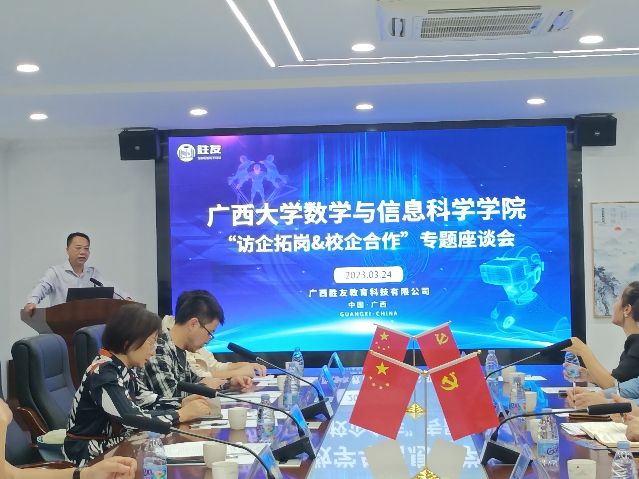 党委书记黄建荣、院长郭真华、党委副书记郭海燕、副院长袁功林、系主任金德泉、教师张幸与辅导员刘春霞一行前往广西胜友教育科技有限公司(以下简称“胜友教育”)开展“访企拓岗&校企合作”专项行动,受到胜友教育董事长罗起清、总经理罗剑、副总经理罗丽婕的热忱接待。企业方首先陪同参观了胜友教育发展概况,随后院企进行座谈交流。广西广电网络耀象教育科技公司总经理韦晓宇应邀出席座谈。