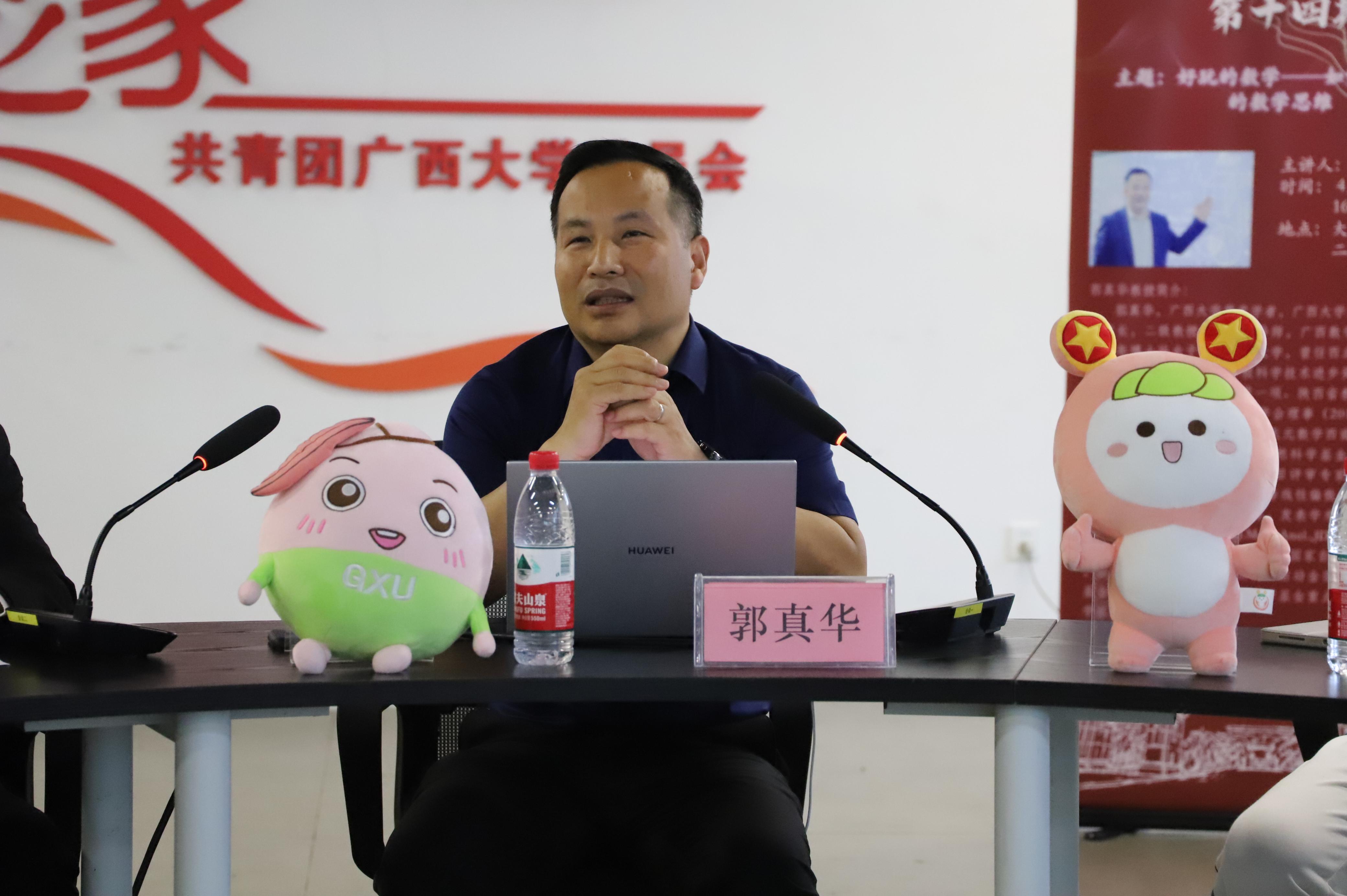 的青年学生围桌而坐,分享了自己在教学科研历程中的感想感悟。他认为,在国家日益重视基础学科的今天,教学不只是一份职业,更蕴含着深刻的社会意义,除了教授课堂知识,更要引导学生成长,塑造学生品格、品行、品味,做大先生。数学学科的教学更要具备定力和热爱,教师们应当潜心钻研、笔耕不辍,立志推动国家基础学科建设发展。郭真华教授告诉同学们,学习数学的意义不在于学具体的技巧,而在于善于用数学的思维来思考。“方程发生代数,代数指导方程”,郭教授生动例举“鸡兔同笼”、“解方程”、求根公式、微分方程等数学案例,启发大家用多维而理性的数学思维思考实际问题,感受数学的魅力。