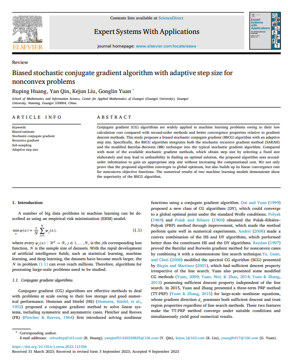 袁功林教授与其在读硕士研究生黄汝平、秦燕和刘科俊合作在人工智能类期刊《Expert Systems with Applications》上在线发表了题为“Biased stochastic conjugate gradient algorithm with adaptive step size for nonconvex problems”的学术论文,实现了太阳城app