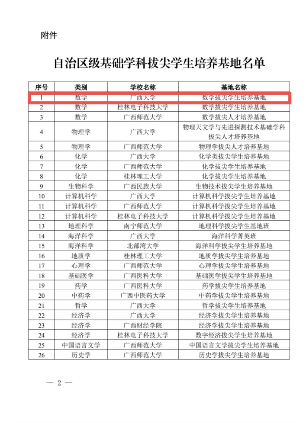 近日,自治区教育厅公布了自治区级基础学科拔尖学生培养基地名单,太阳城app 数学拔尖学生培养基地入选。全区共遴选确定26个自治区级基础学科拔尖学生培养基地,其中太阳城app 共7个基地入选自治区级基础学科拔尖学生培养基地。