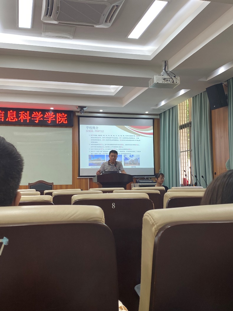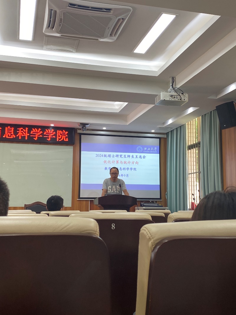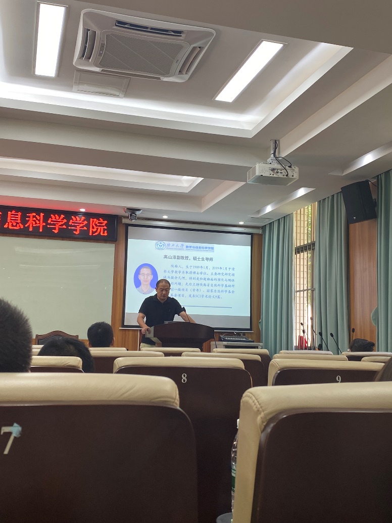 的科研发展历程、师资力量以及研究方向。随后,由来自偏微分方程及其理论应用、优化计算与统计、代数函数、几何拓扑这四大核心研究方向的四位导师代表——何其涵副教授、杨宇宁教授、李靖建教授、闫卫平教授,轮流上台,逐一分享了各自团队中每位导师的情况,包括专业背景、所承担的科研项目以及取得的科研成果等。为与会者呈现了生动且充满启迪的科研画卷。会议尾声,导师们与同学们进行了一对一的亲切交流,加深了师生间的了解。