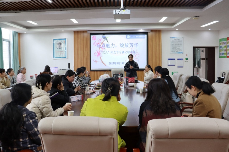工会在506报告厅举办"妆点魅力,绽放芳华"形象提升专题讲座,邀请高级化妆师于莹老师担任主讲,20余名女教工齐聚一堂,共同开启了一场关于美与自信的探索之旅。于莹结合女教师形象管理需求,通过"理论+实操+互动"三位一体教学模式,系统讲授产品选用、妆容设计、色彩搭配等实用技巧,她通过现场化妆演示,让每位参与的老师感受到妆容背后的自信与力量。